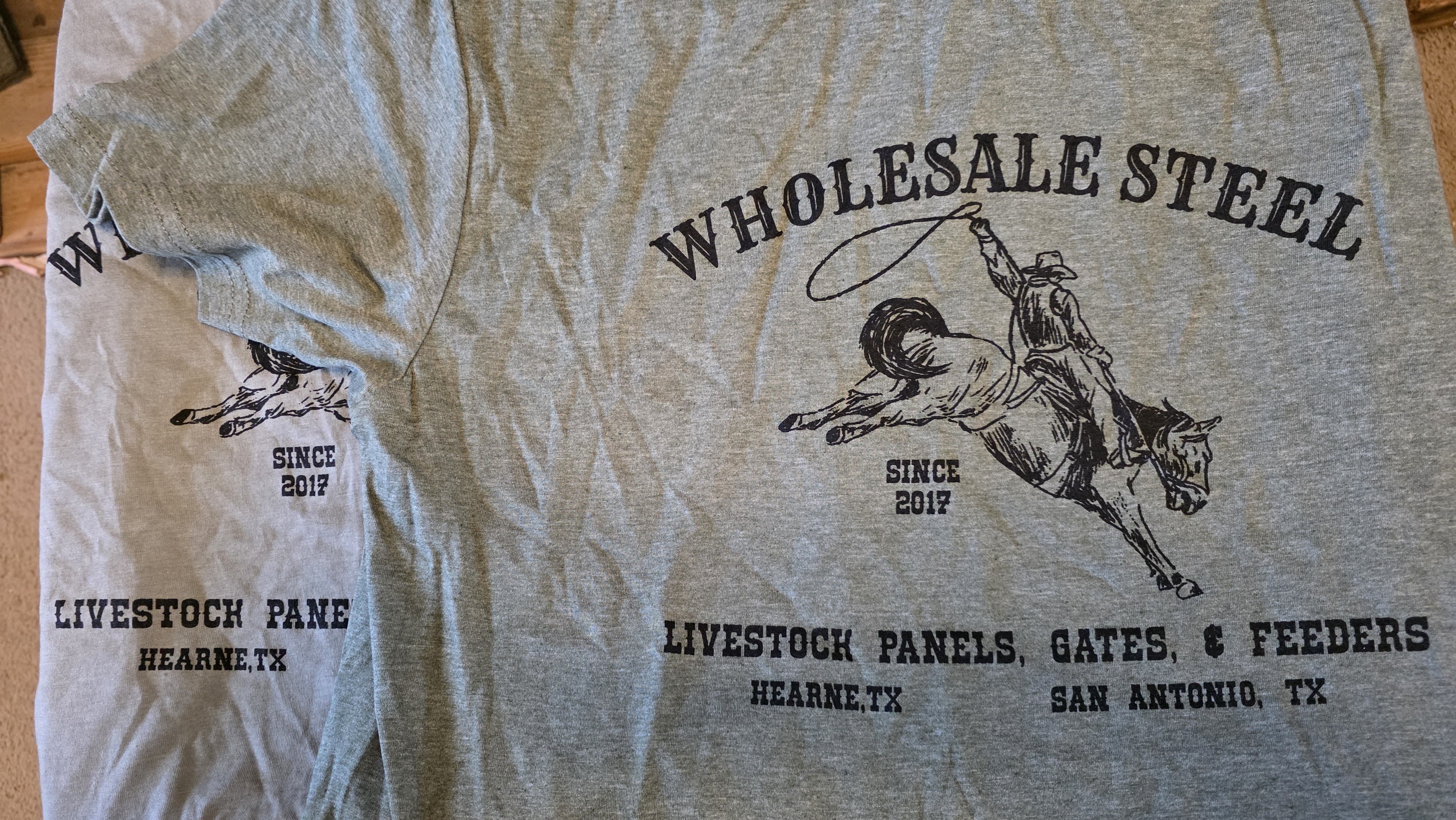 Rep the Wholesale Steel brand with our official logo tee. This classic heather grey t-shirt features a rugged, sketch-style illustration of a cowboy on a bucking bronco, paying homage to our Texas roots.
